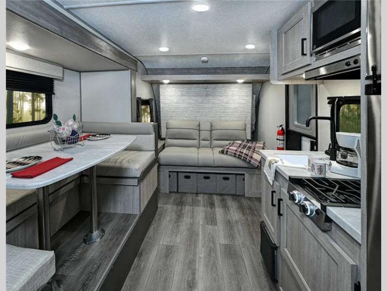 Each is built with an Off Grid Solar system, a spare tire, a flip-down cargo rack with 200 lbs. capacity, oversized off-road fender flares and all-terrain tires. Also included is a 3" lift kit, built-in roof backers with kayak rack prep, a heavy duty standard tongue jack, and a diamond plate rock guard for protection while traveling on the highway or off-grid. The interior provides seamless Thermofoil countertops throughout, and the kitchen offers a deep basin farm style sink with high rise bullet style faucet, plus USB ports and outlets to keep everything charged. There are many more features that offer comfort and convenience.