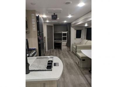 This travel trailer is perfect for your whole crew! Once you arrive at the campground, you can put out the 21' electric awning and start lunch on the exterior camper kitchen with a griddle and mini fridge. There is also a pass-thru storage plus additional exterior storage with a fold-down table and a TV hookup for added convenience. And since there are dual entry doors found on this unit, you can enter in through the full bath in the back, or the main living area towards the front! A large slide provides ample space to move about, and you'll find a trundle sofa and U-shaped dinette here for cozy seating and sleeping space. Speaking of sleeping, there is a front RV queen bed in the bedroom plus double-size bunks in the back for guests!