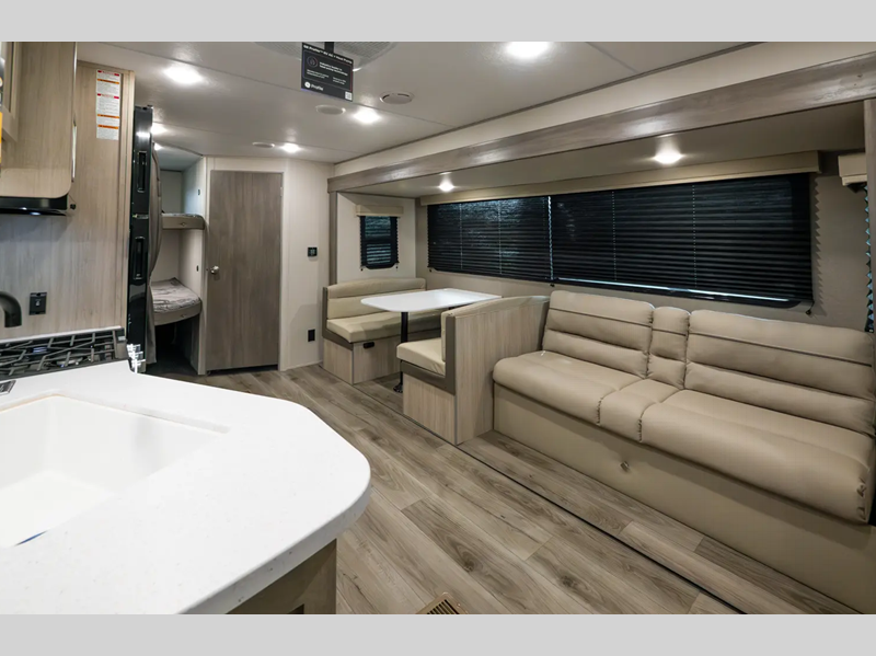 Coachmen prides themselves in having the perfect balance of features and functionality with features like MORryde StepAbove Solid Step entrance steps, the electric awning with multicolor LED strip and remote, and the universal solar prep. A cambered structural steel I-beam frame holds it together and a seamless Alpha roof membrane protects the units interior. Speaking of interiors, there are seamless Thermofoil countertops throughout, Congoleum woodplank linoleum flooring, USB ports, and many more comforts!