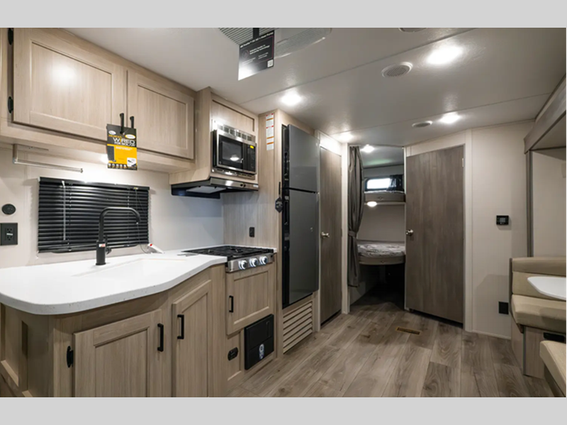 Sleeps 7 Length 25 ft 11 in Ext Width 8 ft Ext Height 11 ft 1 in Int Height 6 ft 9 in Hitch Weight 544 lbs GVWR 7544 lbs Dry Weight 4585 lbs Cargo Capacity 2959 lbs Fresh Water Capacity 44 gals Grey Water Capacity 40 gals Black Water Capacity 30 gals Furnace BTU 30000 btu Number Of Bunks 2 Available Beds Queen Refrigerator Type 12V GE Stainless Refrigerator Size 10.7 cu ft Cooktop Burners 3 Number of Awnings 1 LP Tank Capacity 20 lbs Water Heater Type Tankless On Demand AC BTU 13500 btu Awning Info 15' Electric w/Multicolored LED Light Strip and Remote Axle Count 2 Number of LP Tanks 2 Shower Type Tub/Shower Combo Electrical Service 30 amp Similar Floorplans