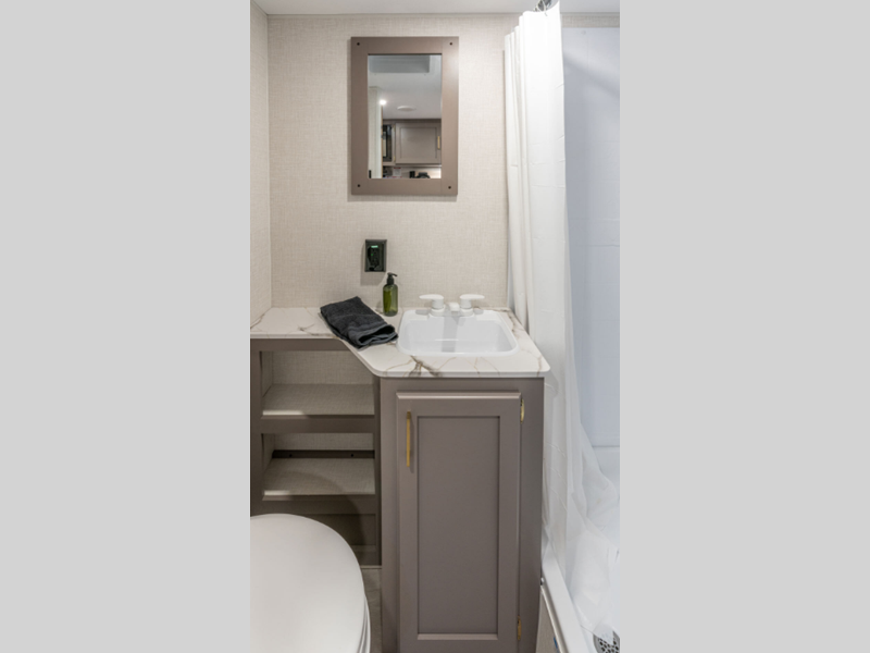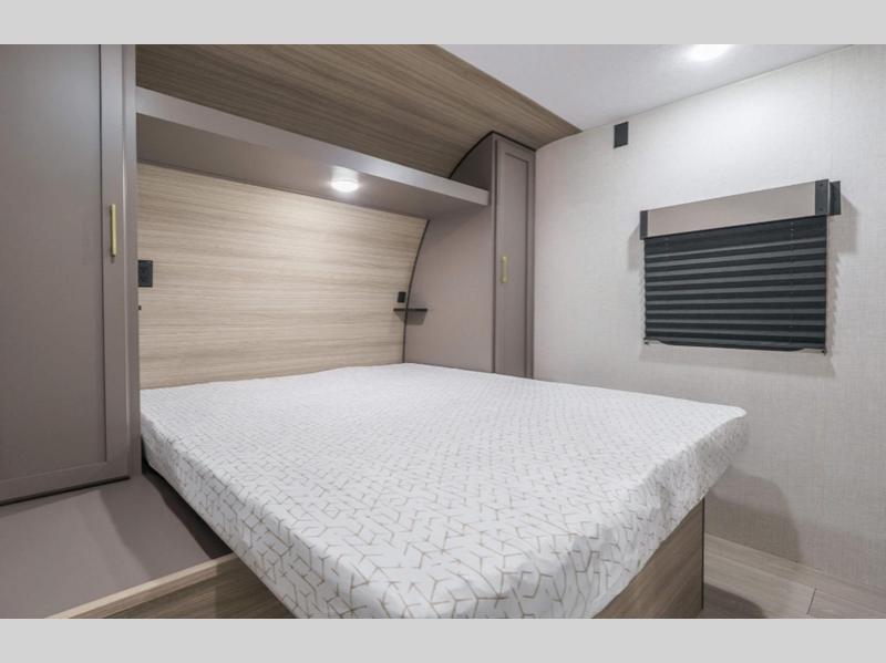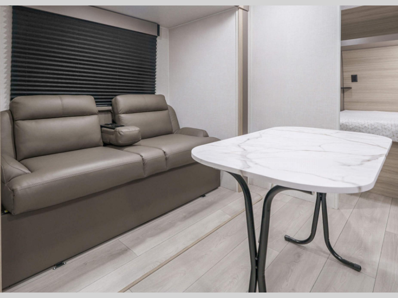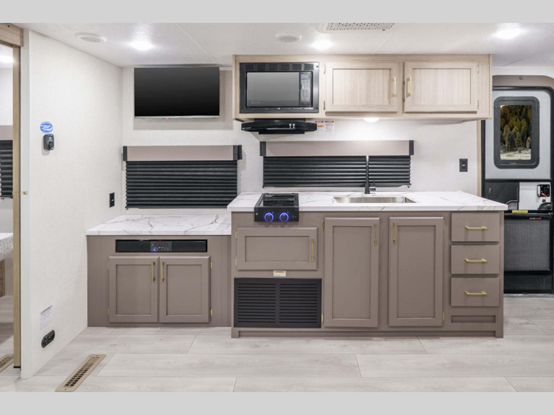 A tankless hot water heater will let you enjoy endless hot showers, and the RV Airflow A/C System with an air filter means you'll stay comfortable during the hot summer camping months. Each model also includes an aerodynamic front profile with a sleek smooth metal front, along with a two toned exterior metal that is sure to turn heads at the campground. There are seamless countertops with a stainless steel kitchen sink, residential grade linoleum, wider pocket/passage interior doors, plus many more comforts inside.